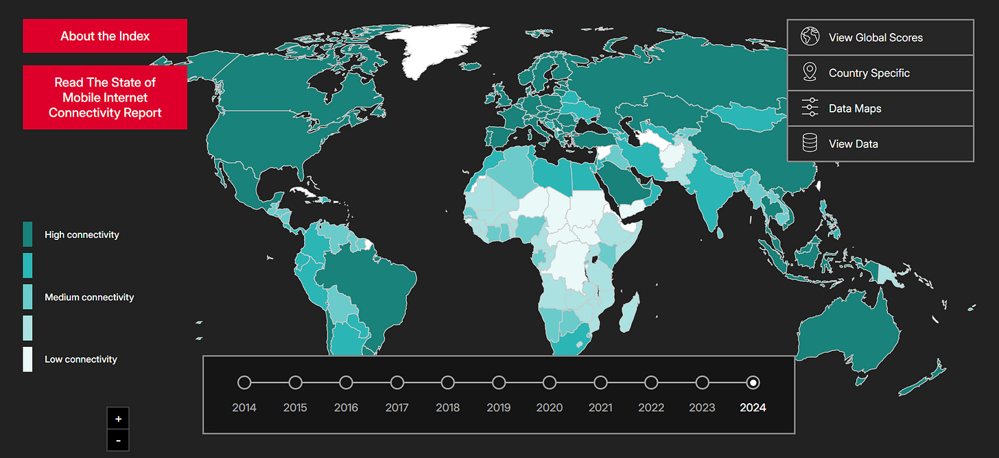 Screenshot from GSMA’s Mobile Connectivity Index (https://www.mobileconnectivityindex.com/index.html), captured August 2025.