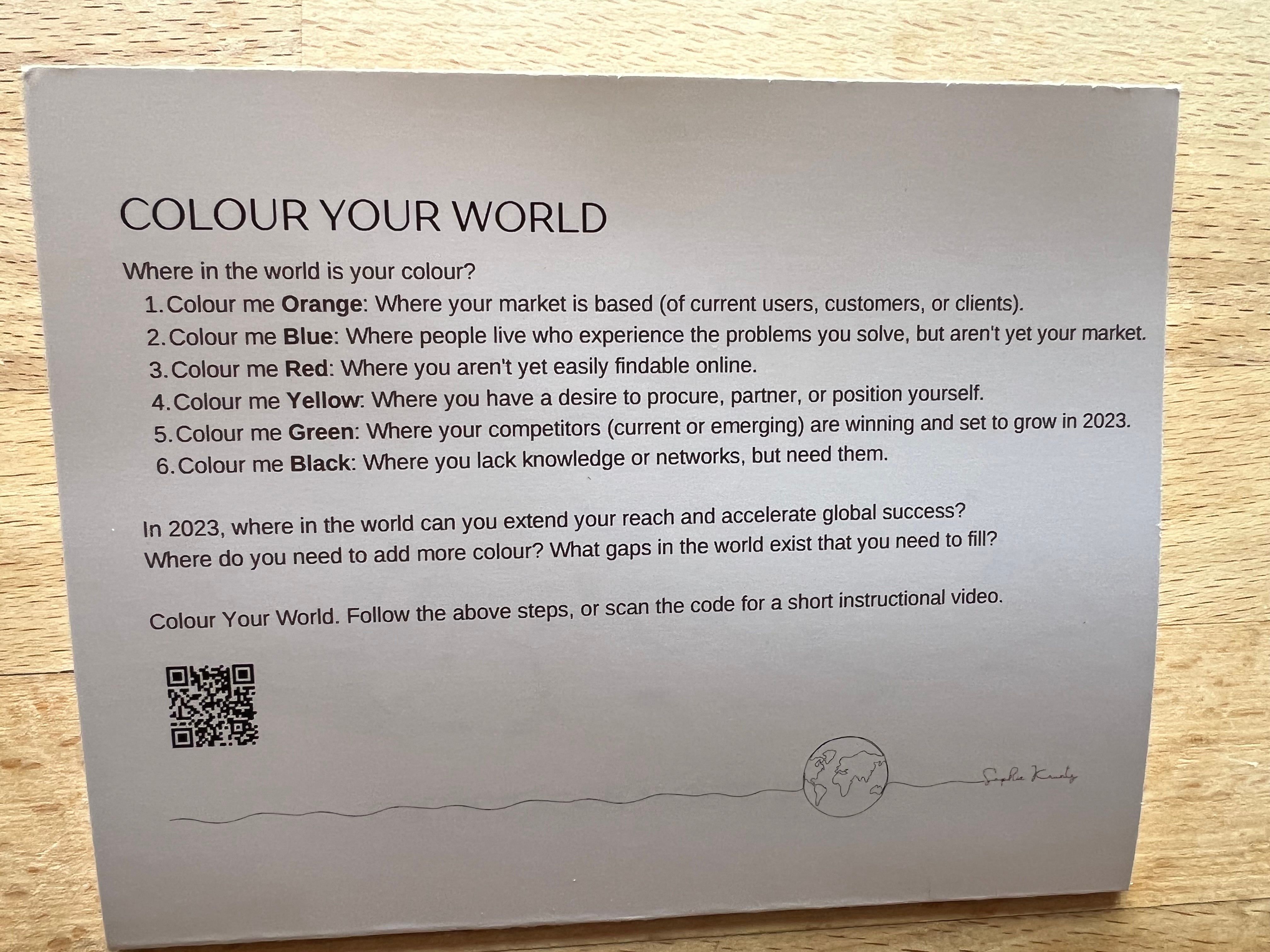The Colour Your World card asked them to reflect on where their markets were, where opportunities lay undiscovered, and where knowledge or networks were missing. Colouring in their world was my way of encouraging people to see more, think bigger, and play a bolder global game.