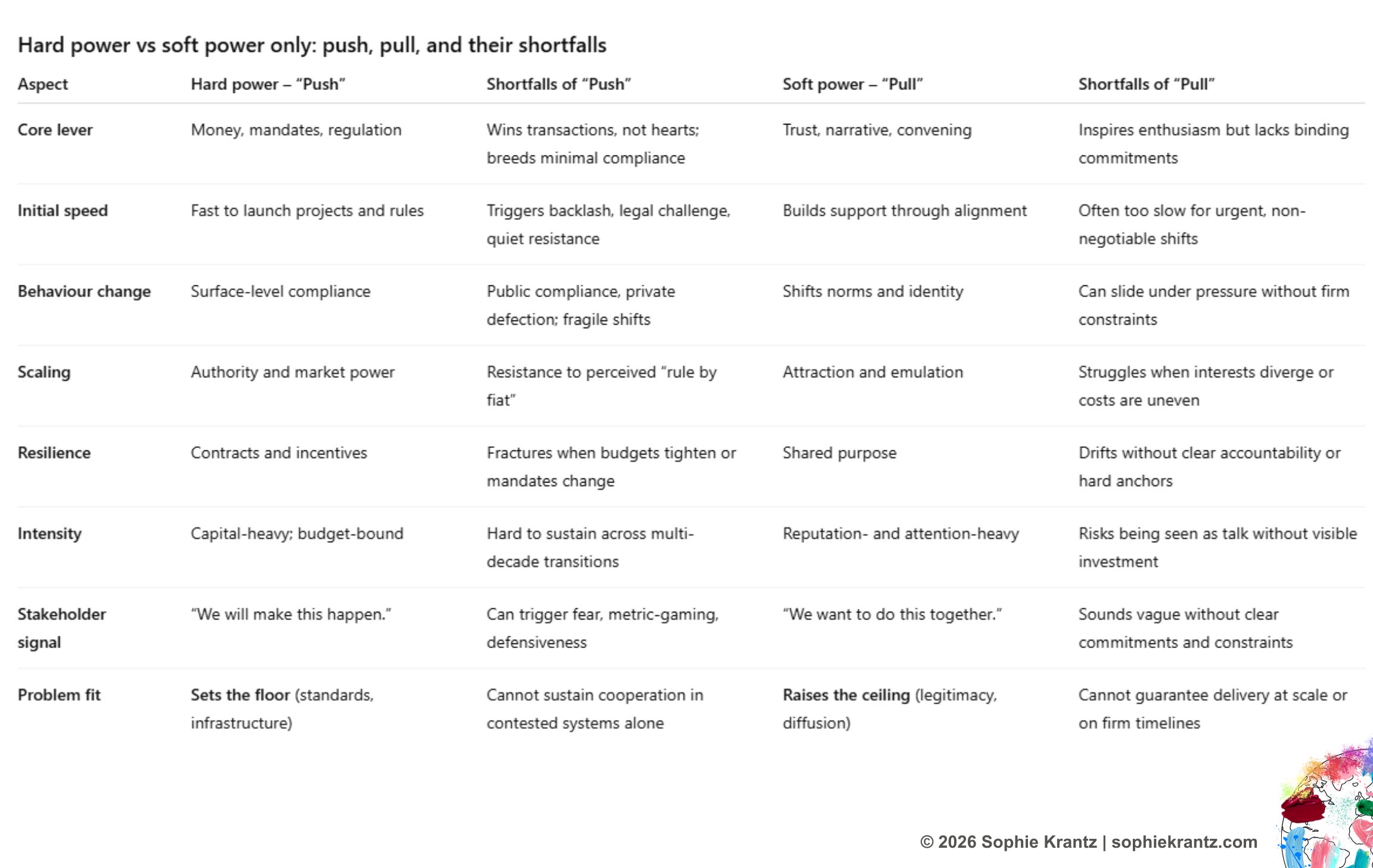 What makes a problem hard is a combination of characteristics: it spans multiple jurisdictions and sectors; it has deep path dependence (so, today’s constraints were created by yesterday’s decisions); it involves competing narratives of fairness; and it is vulnerable to non‑linear shocks and feedback loops. You cannot fix these with a single product, a one‑off capital project, or a press release. They require a portfolio of interventions over time: standards and incentives, technology and infrastructure, coalition‑building and narrative shifts. Hard problems live at the intersection of hard power (capital, mandates, assets) and soft power (trust, legitimacy, convening power). Leaders who see only one side either over‑invest in blunt force or over‑index on talk; the work is in combining both.