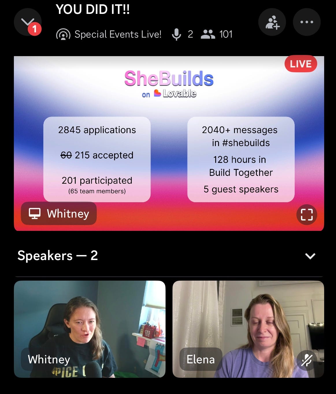 It’s a wrap! Elena Verna and Whitney Menarcheck celebrating with particiapants from around the world, markingt he conclusion of the 48 hour Lovable SheBuilds Buildathon.