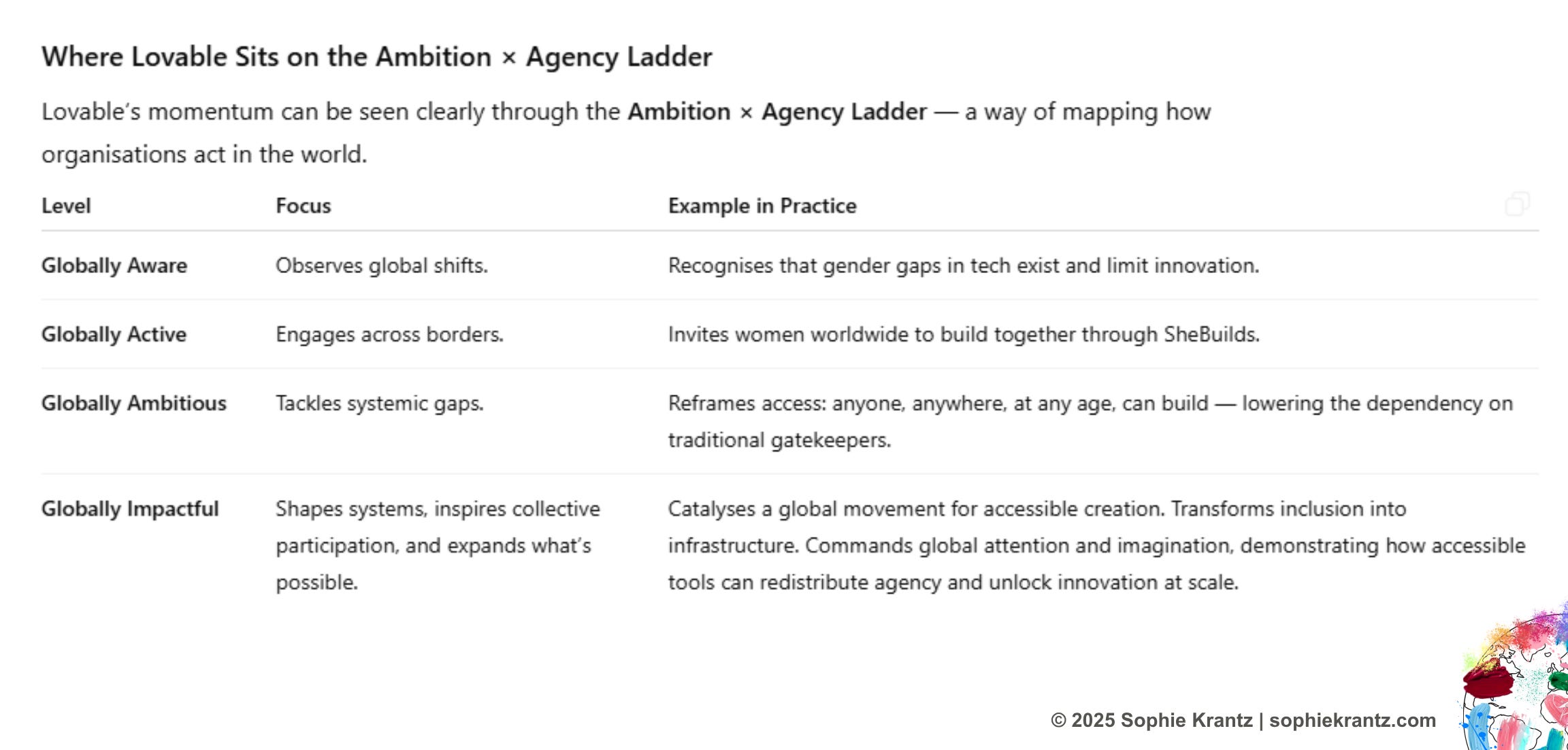 Lovable’s model shows that acting globally can reshape systems. By operating at the Globally Impactful level on the Ambition × Agency Ladder, the company commands global attention and inspires collective participation. Lovable sets a high bar for leadership, showing that global progress depends not on the few, but on enabling more of us to build and create together.