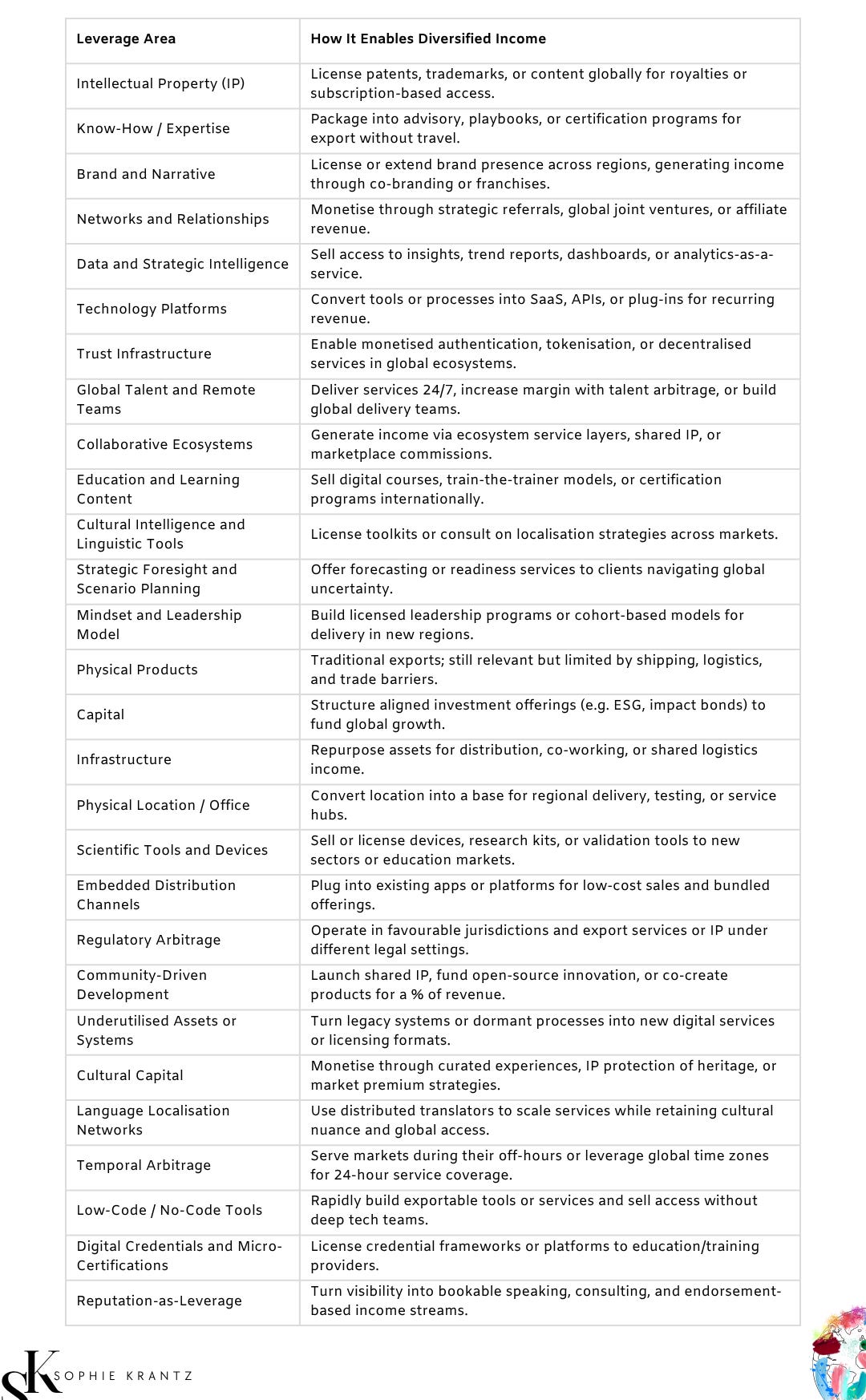 Krantz, Sophie. (2025). Leverage Areas for Diversified Global Income. Adapted and developed from trade, innovation, and intangible asset frameworks.